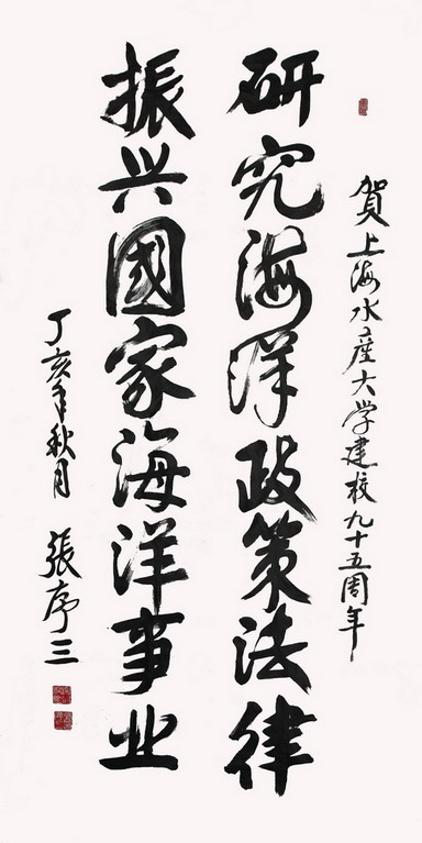10月20日,原海军副司令员、中国太平洋区域安全专业委员会主任张序三中将为我校校庆题词:“研究海洋政策法律,振兴国家海洋事业”,祝贺我校校庆95周年。