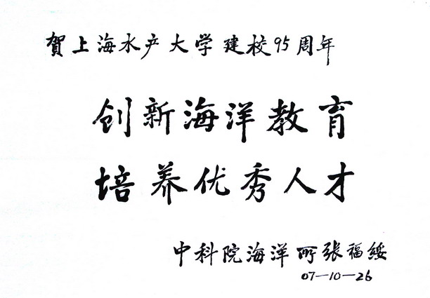 校校庆题词:“创新海洋教育,培养优秀人才”,祝贺我校校庆九十五周年。