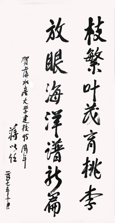 在我校校庆庆典进入倒计时之际,上海市政协主席蒋以任同志日前为我校校庆欣然题词:“枝繁叶茂育桃李,放眼海洋谱新篇”,祝贺我校建校九十五周年。