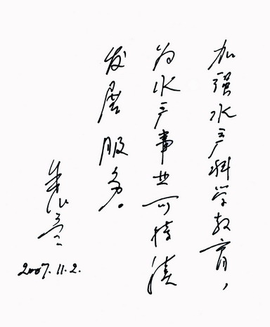 日前,被誉为“转基因鱼之父”的国家自然科学基金委员会副主任、国家淡水生态与生物技术重点实验室主任、中国科学院院士、第三世界科学院院士朱作言教授为我校校庆题词:“加强水产科学教育,为水产事业可持续发展服务”,祝贺我校建校九十五周年。 (校庆办公室)