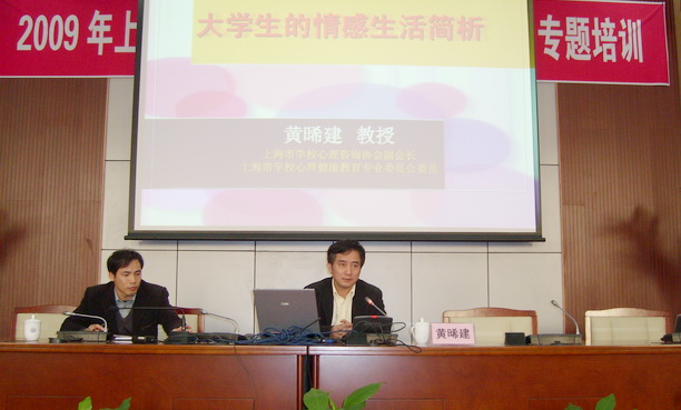 3月26日下午,上海市学校心理咨询协会副会长、上海市学校心理健康教育专业委员会委员,校党委副书记、副校长黄晞建教授为2009年上海高校辅导员“心理危机干预”专题培训班做了主题为“大学生的情感生活简析”的专题讲座。来自10所高校的近百名辅导员和心理工作老师聆听了报告。