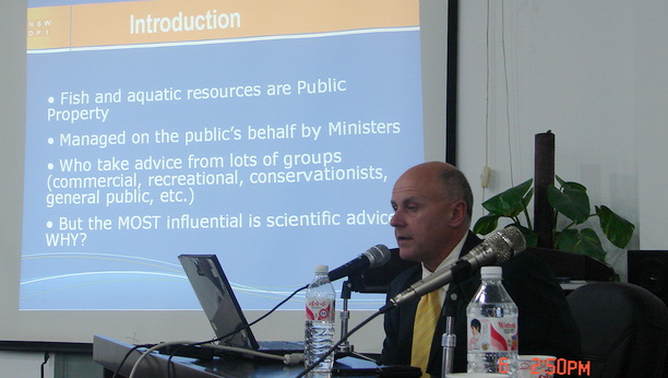 访问期间,George Davey副部长、Steve Kennelly教授分别作了题为“加强合作,促进新南威尔士州农业、渔业、森林、矿业的经济效益和可持续发展”与“新南威尔士州的渔业研究”的学术报告。Davey先生曾任澳大利亚新南威尔士州食品局局长,是2008年北京奥运会食品安全委员会的国外专家,对食品安全管理和相关政策有非常丰富的经验。Kennelly先生主要从事鱼类生物学研究、物种调查和野生鱼类等方面的研究工作。报告中,Davey先生介绍了澳大利亚新南威尔士州第一产业部的主要工作,特别是其中渔业部门的工作,以及该部所开展的国际合作,同时还为在场师生介绍了澳大利亚在举办各种大型活动中保证食品安全的相关经验。Kennelly教授则就如何将渔业研究与渔业管理和政策制定有机结合起来进行了全面系统的阐述。