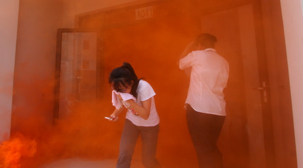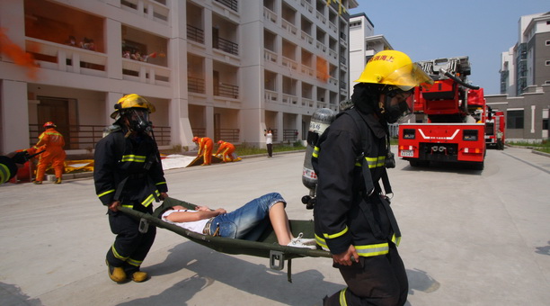 随着潘迎捷校长演习开始口令的下达,工作人员拉燃了烟雾弹,宿舍楼顿时浓烟滚滚。“阿姨,不好了,着火了!”首先发现火情的同学边呼救边跑向值班室报告,并拨打“119”火警电话报警,同时报告了校保卫处。学校立即按预案开展工作,公寓值班人员迅速切断楼内电源,打开了消防通道,楼内300多名学生用湿毛巾手捂口鼻穿过浓浓烟雾,在管理员和学生安全员的引导下沉着有序地疏散到安全地带。接到报警的消防队员和学校保安迅速赶到现场,窗台转移、担架救人、跳气垫床、云梯救人、滑梯救人等灭火救援行动随之有序展开。15名被困火场的学生一一获救,观众席上响起了阵阵掌声,演习圆满成功。