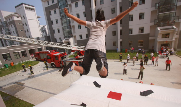 高空云梯、救生气垫、高压水枪同时展开,“火魔”成功被降伏,演习圆满结束。