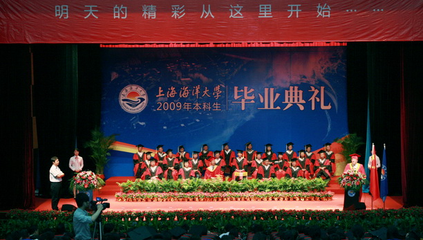 毕业典礼在雄壮的国歌声中开始。院长高健教授富有诗意的致辞,拉开了今天毕业典礼的序幕。学院副院长平瑛教授宣读《上海海洋大学学位评定委员会关于授予学士学位的决定》,学校学位委员会主席,校长潘迎捷教授、副校长封金章教授及校长授权的学位委员会委员们一起为毕业生颁发毕业证书和学位证书。学院党委书记岑伟平宣读《关于表彰2009年“上海海洋大学优秀毕业生”暨“上海市普通高等学校优秀毕业生”的决定》,校长潘迎捷教授为获得优秀毕业生代表颁发了荣誉证书。毕业生代表邹丽婧同学发言时演唱了一首《我的未来不是梦》,用歌声表达了对母校、对恩师、对家长的感激之情,表达了对四年同窗好友的美好祝福,表达了对母校的美好祝愿。现任上海电视台体育频道《今日体育快评》节目主持人、我院2006届毕业生刘鹏代表杰出校友发言,他用热情洋溢的言语,将美好的祝福送给了即将毕业、走上工作岗位的师弟、师妹们,祝他们事业有成!