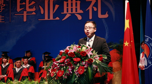 毕业生代表邹丽婧同学发言时演唱了一首《我的未来不是梦》,用歌声表达了对母校、对恩师、对家长的感激之情,表达了对四年同窗好友的美好祝福,表达了对母校的美好祝愿。现任上海电视台体育频道《今日体育快评》节目主持人、我院2006届毕业生刘鹏代表杰出校友发言,他用热情洋溢的言语,将美好的祝福送给了即将毕业、走上工作岗位的师弟、师妹们,祝他们事业有成!