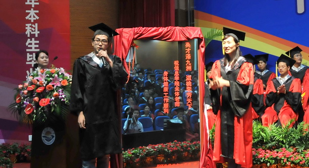 气势磅礴的国歌后, 院长黄冬梅教授言简意赅、语重心长的致辞拉开了毕业典礼的序幕。二百多名毕业生身穿学士服,依次从校领导和院学位委员会教授中接过他们大学生涯的硕果——学位证书和毕业证书,各个脸上洋溢着收获的笑容,因为大家都知道在证书的背后收录着他们大学生涯的喜怒哀乐、点点滴滴,那是值得一生去珍藏的美好回忆。随后信息学院黄院长、院党委施书记为校优秀毕业生代表颁发了荣誉证书,10位市优秀毕业生代表也受到了校党委副书记副校长黄晞建教授、副校长黄硕林教授、校长助理吴建农教授的隆重表彰。作为毕业典礼的主角,毕业生代表宋倩倩发言中,不仅回顾了同学们在学海路和临港的学习生活经历,表达了对母校和学院的留恋,及对各位“传道、授业、解惑”的教师和默默耕耘,无私奉献的家长们的衷心感谢,并表示在海大的收获是丰厚的,作为一段人生旅途的终点和另一段旅途的起点,他们将继续坚持真理,续写自己人生的壮丽篇章。为了表达同学们对母校、对学院的感恩,同学们还挑选了一个“师表镜”赠送给学院,“育英才泽九洲,滋桃李芳天下”,祝愿信息学院的明天有如明镜一样的清澈明亮。信息与计算科学系主任张建新老师如亲人般的发言中,无论是对同学们顺利毕业的“祝贺”、还是对悉心培育他们成才的家长的“恭喜”,亦或是对即将走向社会同学们的“叮咛”和“提醒”,句句肺腑,字字深情,更加深了同学们与老师的不舍之情。