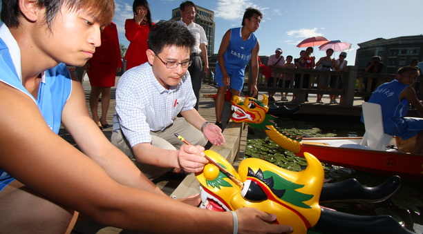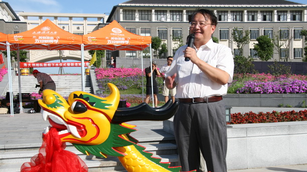 为了进一步鼓励和支持学校划船运动的发展,改善龙舟队训练条件,加快水上运动的复兴。在校领导的关心和支持下,体育部近日购进了两条浙江“祥瑞”龙舟。7月13日,我校在亲水台旁举行了简短而隆重的龙舟下水仪式。潘迎捷校长、程裕东副校长共同为新龙舟揭幕,并为新龙舟点睛,人文学院院长张继平到会祝贺,体育部常务副主任叶鸣教授主持仪式。