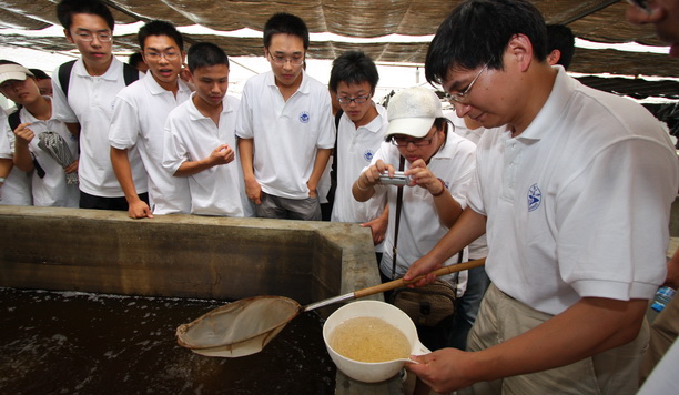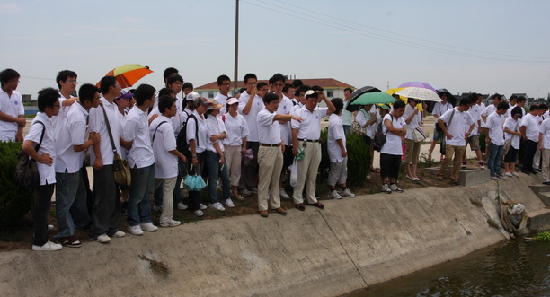同学们在虾池边听取戴习林教授讲解虾苗培育