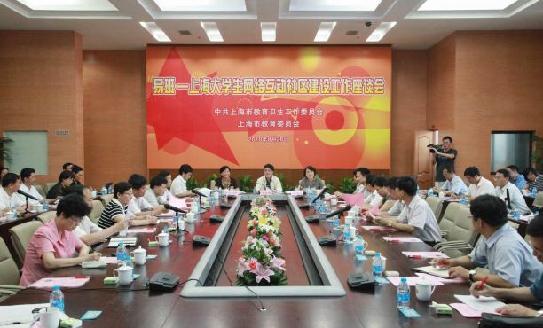 2010年8月26日下午,易班——上海大学生网络互动社区建设工作座谈会在我校召开。市教卫党委李宣海书记、杜慧芳副书记,校党委书记虞丽娟、副书记副校长黄晞建及上海各高校分管书记、校长共80余人出席会议。会议由市教卫党委副书记杜慧芳主持。