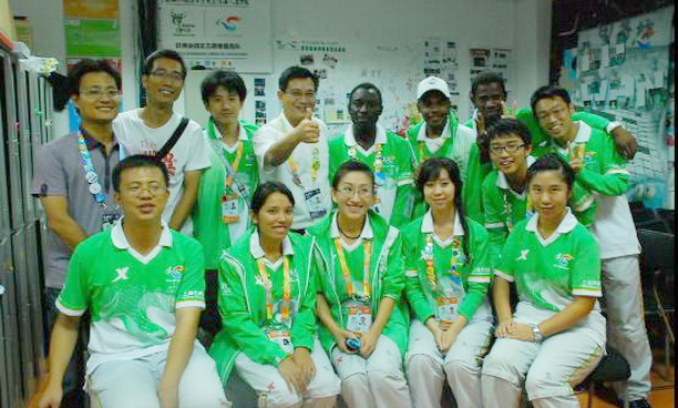 在世博园非洲联合馆,正值志愿者们的午餐时间,程裕东副校长看望了留学生志愿者,并亲自为每位志愿者佩戴了激励徽章,肯定了他们几天来的工作,详细询问了最近的一些工作情况,希望他们再接再厉做好后面的工作。同时嘱咐他们要利用午休时间好好休息,劳逸结合;要结合自身优势为中外游客服务。