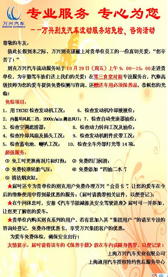 别克万兴汽车流动服务站于10月29日(周五)上午9:00~15:00走进我校,在第三食堂对面专设服务台,汽修高级技师为您的爱车提供免费检测与咨询。望广大有车族积极参加。