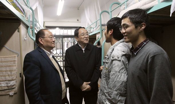 正当俞正声书记就要离开宿舍时,热情的学生涌在宿舍大门口,向俞书记问好,俞书记又走上前与学生握手交谈,并走进其他普通在校大学生的宿舍,与同学们再次进行了交谈,对学生关心的就业问题、留沪问题和房价高等问题进行了交流,俞书记勉励同学们好好学习,将来好好工作,同学们的关心的事情就都会得到实现。临行前,俞书记再次到其他的宿舍查看了学生宿舍的卫生情况、学生的卫生间和生活设施,对学生们的良好卫生习惯给予了表扬和肯定。