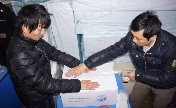 2013年1月8日是我校崇明扣蟹养殖基地抓捕和筛选第一批蟹种入台的关键时刻,我校第一批蟹种7.7万尾将于1月9日到达台湾苗栗养蟹农户。下午,校党委书记虞丽娟教授在校办张敏主任和水产与生命学院吴旭干副教授的陪同下,实地视察并指导我校崇明供台蟹种捕捞、筛选和装箱情况,亲切看望了正在基地辛勤工作的博士后李嘉尧,硕、博士研究生刘智俊、何杰、卢义、陈浩、曾奇韬、陈伟等,对寒冬期间仍能艰苦奋战于基地的老师和同学们表示慰问和衷心感谢。同时,带领物联网工程课题组(海洋大学与同济大学合作团队)成员,全面实施中华绒螯蟹蟹苗养殖物联网智慧服务系统。