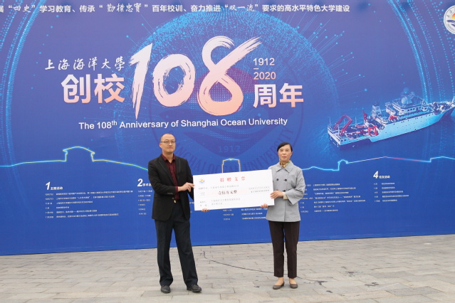 上海海洋大学总会计师、基金会副理事长郭爱萍在现场接受了校友的捐赠。