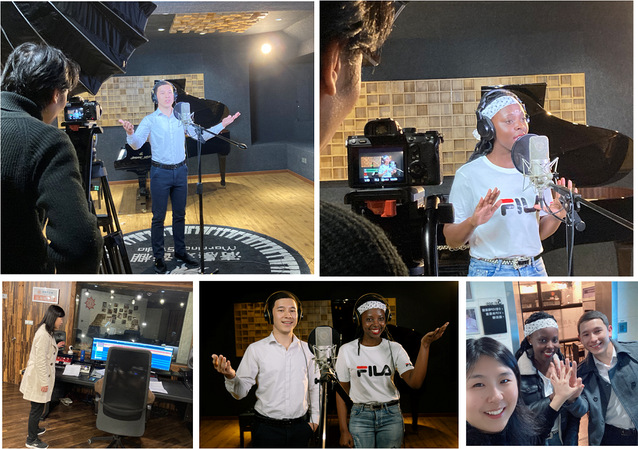 最初,上海海洋大学两位学生在线上向申团长学习歌曲,国际文化交流学院吴江楠老师也帮学生纠正汉语发音,音准过关后,老师带学生前往专业录音棚录音。为高质量完成分配的中文歌曲音频和视频录制任务,特把校园内的录制分成不同时间、不同场景进行,周末时间也加以利用,以保证时效。在学校一号门拍摄为冬奥送祝福期间,门卫师傅为营造安静的环境,特地帮忙让过往车辆短暂停下,细微感动萦绕于心。上海海洋大学来自印度尼西亚的2018级食品学院本科生ANGGUN MULIA FORTUNATA(王秀玲)虽未参与演唱,但得知有机会给北京冬奥会送祝福,她认真准备祝福语,积极参加。过程中,师生合力克服了天气、身体不适等问题,用梦想和坚持战胜困难。
