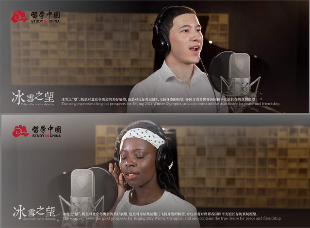 2022年北京冬奥会即将开幕,全球来华留学生用音乐为北京冬奥会送上美好祝福,百名来华留学生组成了留学中国“云”合唱团,大家倾情演唱中英文主题歌曲《冰雪之望》,以歌为媒、唱响云端。《冰雪之望》这首歌由中外青年携手创作,词曲作者是来自中国、韩国、墨西哥三国的学生,中国24所高校50多个国家的百余名来华留学生参与演唱,还有些留学生目前仍然身在国外。距离和挑战阻挡不了各校师生的热情和为奥运献礼的心愿。