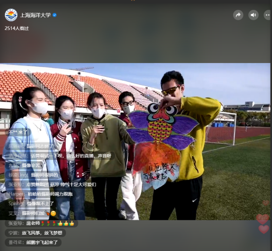 一笔一画书写心愿,一线一图放飞青春。美好春光少不了风筝相随,跟随主播的脚步,东操场上汉文化社的同学身着霓裳,正挥洒色彩于风筝上。同学们在活动中体味生活之美,传承传统工艺,同时也是体育部在疫情间特别开设的风筝课,守护着师生们的健康。体育部庞德功老师讲解到:“这段时间上网课的同学们一直盯着电脑,眼睛和脖子都需要放松,而放风筝的同时,还能呼吸清新空气,对我们的身心健康都有促进作用。”并且还告诉大家在中国传统习俗里,把风筝放高之后剪断风筝线寓意着“放晦气”,祈祷霉运快快走开,好运速速来到的寓意。在老师的带领下,同学们把手中的风筝线剪断向天空大声地祝愿:“让高飞的风筝带走身上的晦气、烦恼、苦闷、忧患和病痛。祝愿我们的生活越来愈好,马上疫情散去吧!”