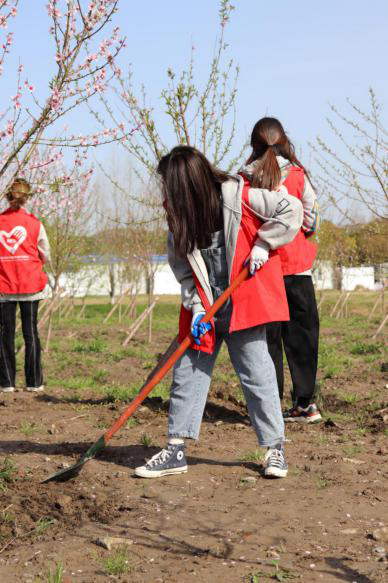 春回大地,万物复苏。桃树林里有师生正在开展修剪桃枝、翻土等劳动实践;有打卡桃园的同学在拍照赏花;还有老师在科普桃林知识。后勤管理处的袁训宏老师在科普的同时表示,桃林是110周年海洋大学校庆今年1月打造的“一心、一轴、一环、五游园”绿化景观项目之一,也是此次“共同守护”劳动教育区域之一,由爱恩学院师生责这片桃林修剪桃枝、送土等劳动实践。