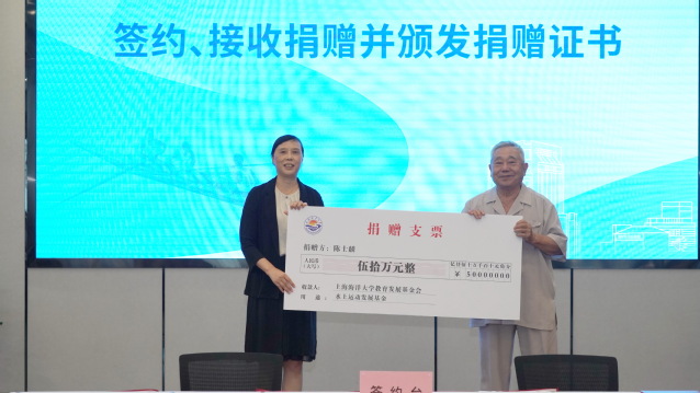 在学校110周年校庆之际,陈士麟个人捐赠50万元支持学校水上运动发展。上海海洋大学教育发展基金会副理事长、总会计师郭爱萍与陈士麟签约,接收捐赠并为陈士麟颁发捐赠证书。