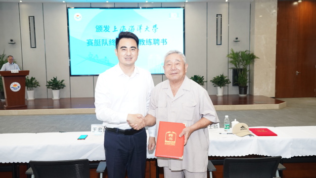 陈士麟是新中国成立之初上海赛艇队的元老,也是名蜚海内外的著名赛艇教练,毕业于1959届海洋渔捞科。无论是读书时积极代表学校劈波斩浪,还是48年的教练生涯为国争光,陈士麟校友一直心系学校的发展,特别关心学校水上运动的复建工作,并亲自指导学校水上运动的发展。校党委书记王宏舟向陈士麟颁发上海海洋大学赛艇队终身荣誉教练聘书,表彰其对学校水上运动事业发展的杰出贡献,同时表示热烈欢迎陈士麟继续为学校发展贡献力量。
