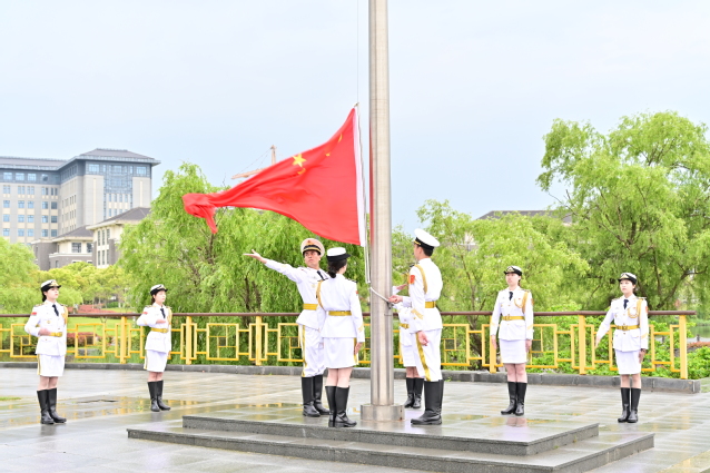仪式上,54名青年代表缓缓将国旗传递入场,用特别的方式庆祝五四青年节。伴随着雄壮的国歌声响起,全体师生、青年代表肃立注目并高声歌唱,鲜艳的五星红旗迎着晨风冉冉升起。