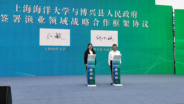 会上,江敏与博兴县党组成员、副县长刘中秋签署了上海海洋大学与博兴县人民政府渔业领域战略合作框架协议,并为上海海洋大学博兴现代渔业技术研发中心和农业农村部渔业信息重点实验室博兴设施养殖数字化示范基地揭牌。