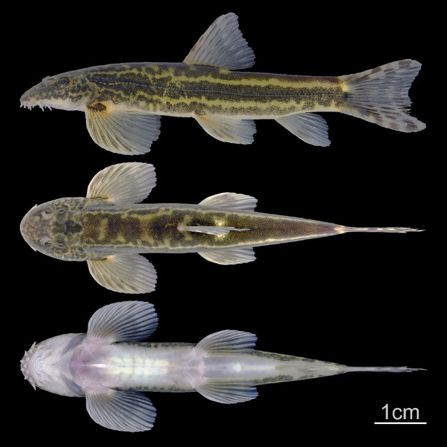研究团队通过分子系统发育分析和形态学比对,发现九龙江种群与花尾缨口鳅存在显著差异。遗传分析显示,两者间的最小遗传距离达4.16%,超过缨口鳅属内多数已定名物种间的差异水平。形态学上,新物种具有独特的双排型吻须、带条纹的浅凹形尾鳍,以及沿侧线分布的宽阔深色纵向条纹等特征。
