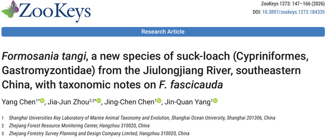 上海海洋大学与浙江省森林资源监测中心等单位近日联合在国际学术期刊《ZooKeys》发表研究成果,正式将福建九龙江流域发现的腹吸鳅科鱼类确立为新物种——文乔缨口鳅(Formosania tangi sp. nov.)。该物种发现于福建省九龙江流域,其命名旨在致敬上海海洋大学唐文乔教授在鱼类学领域的贡献,体现了学术精神的代际传承。论文链接:https://doi.org/10.3897/zookeys.1273.184335。